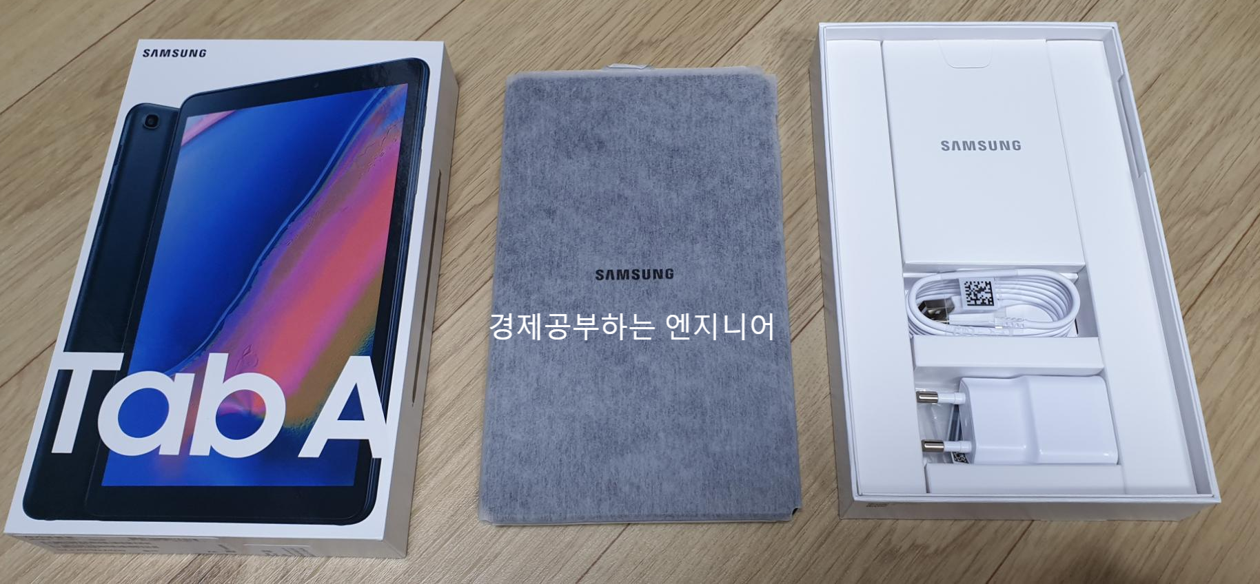 상자를 열어보면 부칙포 같은 제질의 포장이 되어있는 갤럽시탭 A와 나머지 구성품을 보실수 있는데