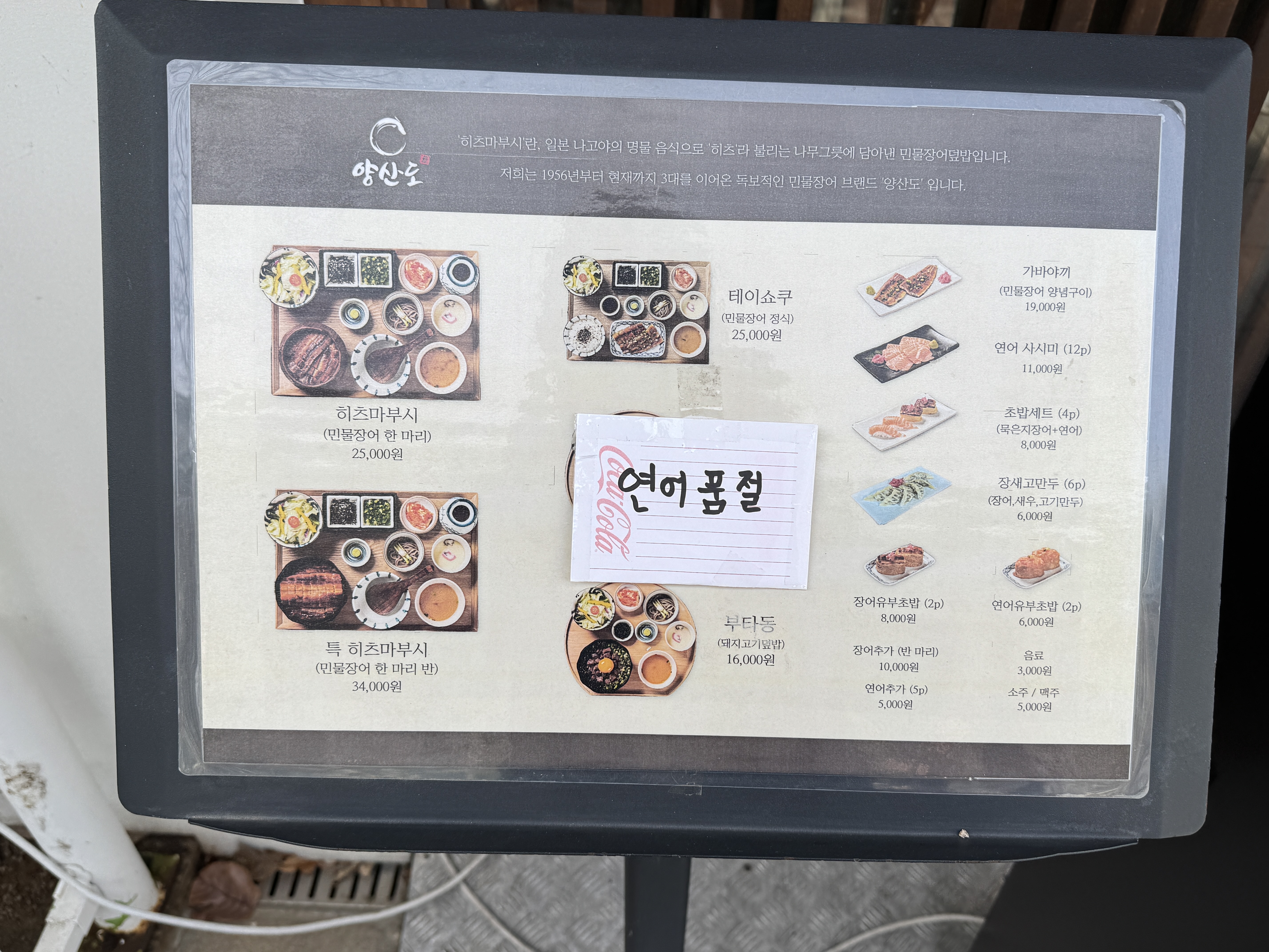 입구에 세워진 입간판을 통해 메뉴를 확인할 수 있는데, 저희가 방문한 날은 아쉽게도 연어 메뉴가 품절이었습니다. 하지만 저희의 목표는 ‘특 히츠마부시’였기 때문에 고민 없이 입장했습니다.