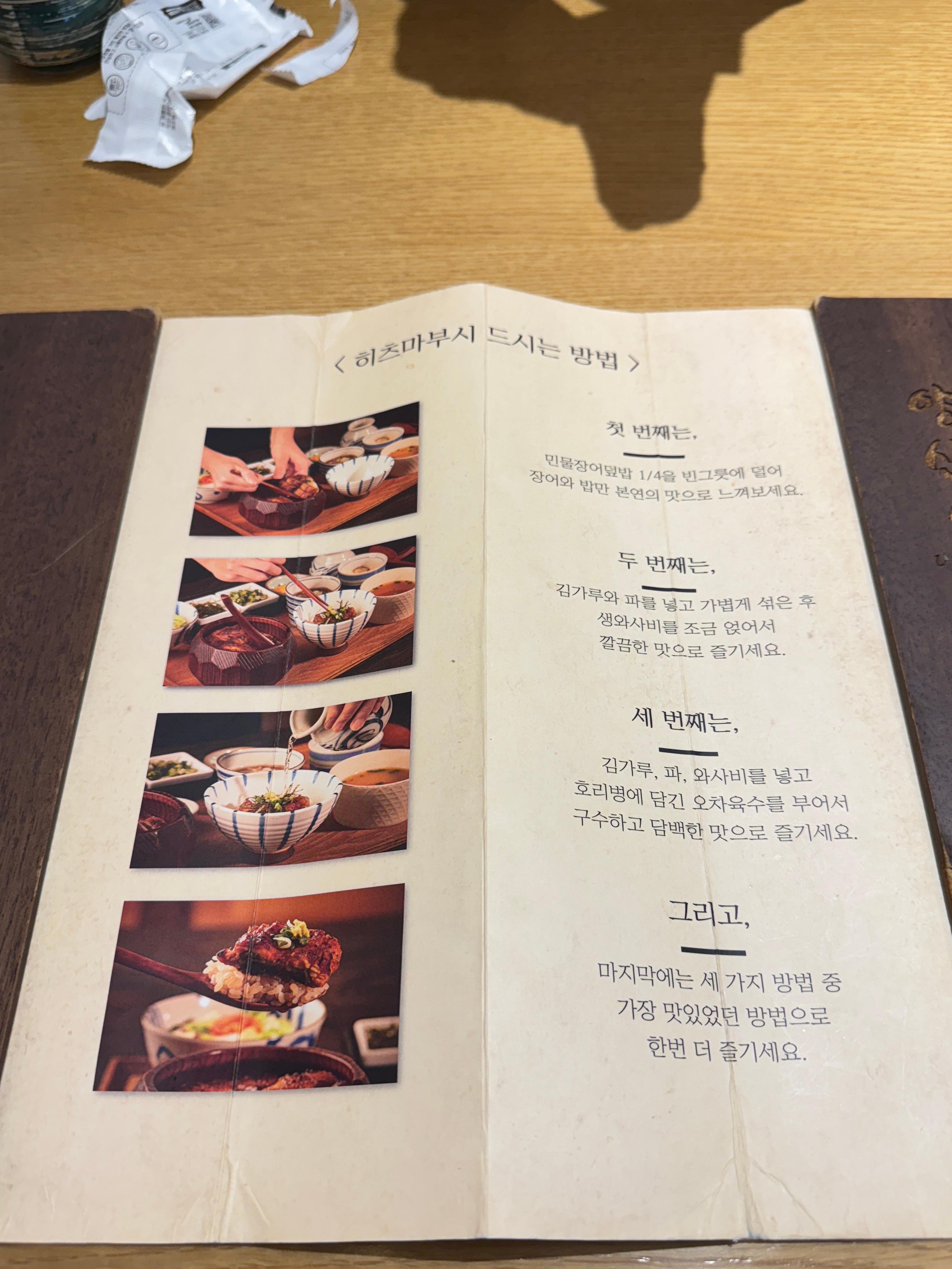 메뉴판을 열면 식사 메뉴가 있고 뒷면에 보시면 히츠마부시를 드시는 방법이 4단계로 되어있습니다.